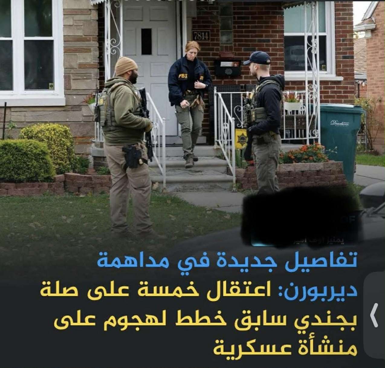 شهدت مدينتا ديربورن وإنكستر فجر الجمعة عملية أمنية واسعة نفذها مكتب التحقيقات الفيدرالي حيث تم اعتقال خمسة شبان تتراوح أعمارهم بين ستة عشر وعشرين عاما يشتبه بتورطهم في التحضير لمخطط إرهابي مستلهم من فكر تنظيم داعش وكان عناصر المكتب قد تابعوا منذ أسابيع تحركات المجموعة عبر تطبيقات تواصل مشفرة وغرف دردشة إلكترونية تتداول أفكارا متطرفة ودعوات لتنفيذ هجوم خلال عطلة الهالوين